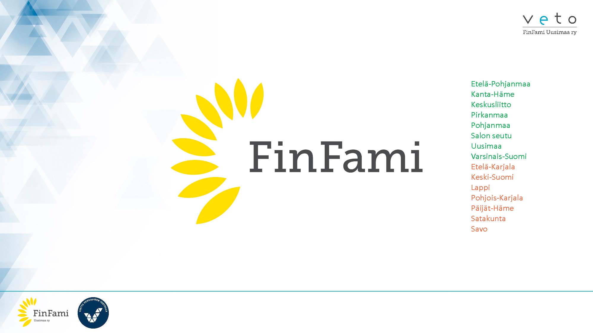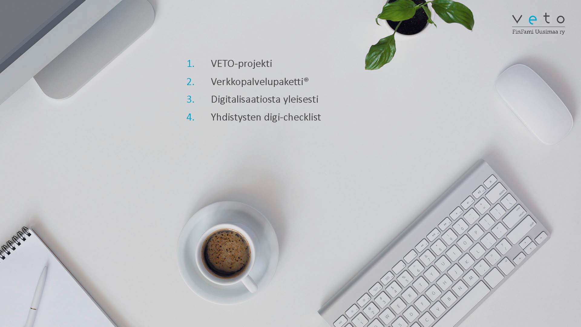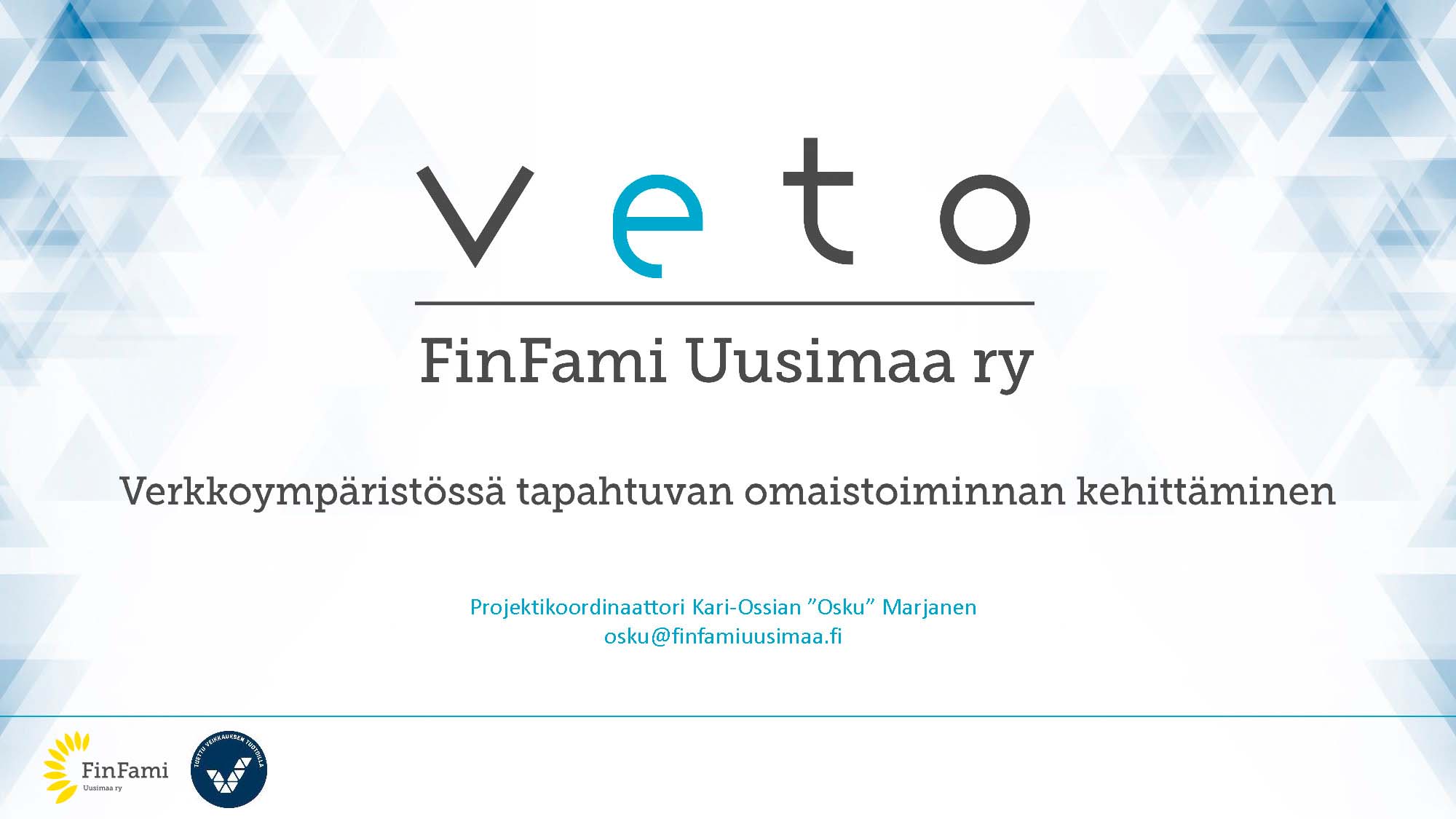 VETO-projekti haki alkuun vauhtia FinFamien valtakunnallista kenttää varten Uudenmaan yhdistyksen tietotekniikan ja prosessien kehittämisellä. Projekti vakioi ja selvitti mitä ohjelmistoja yhdistyksille on tarjolla ja mistä niistä olisi eniten hyötyä perustyön toteuttamisen tueksi. Koko matkan tavoite verkkoympäristössä tapahtuvan omaistoiminnan kehittämisestä, pidettiin kirkkaana mielessä. Vauhtiin päästyämme otimme ensimmäisen loikan, suositukset alueyhdistysten perustan kuntoon saattamiseksi, tulevaisuuden digitaalisia ratkaisuita varten. Suositus piti sisällään ohjelmistot, laitteiden hankintamallin kuin myös ohjelmistojen käytön tueksi laadittuja suosituksia mm. sisäisenviestinnän parantamiseksi. Tämä paketti mahdollistaa nyt ja tulevaisuudessa valtakunnallisen yhteistyön, kun kaikki käyttävät hyväkseen samoja ohjelmistoja ja ympäristöjä.