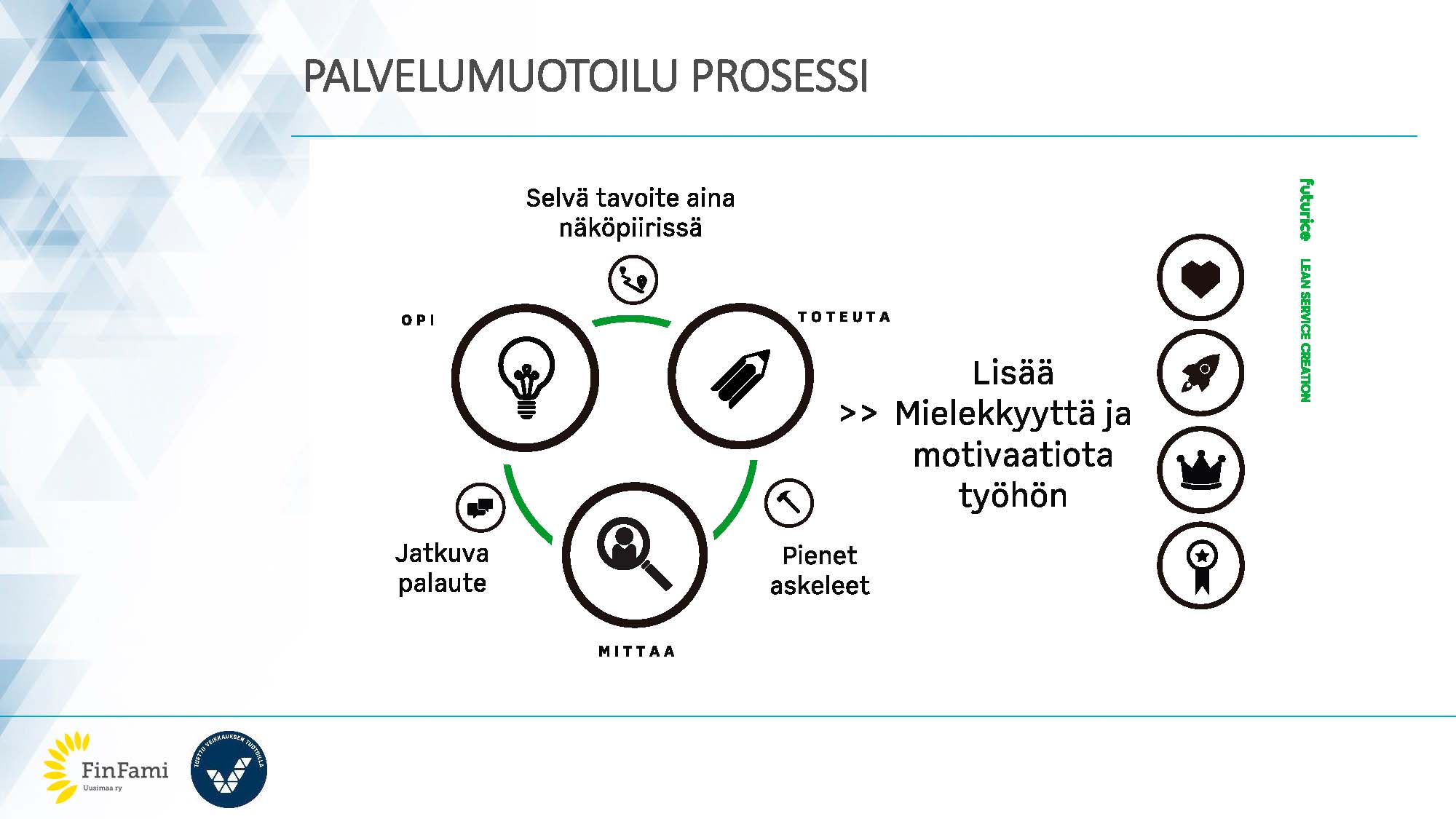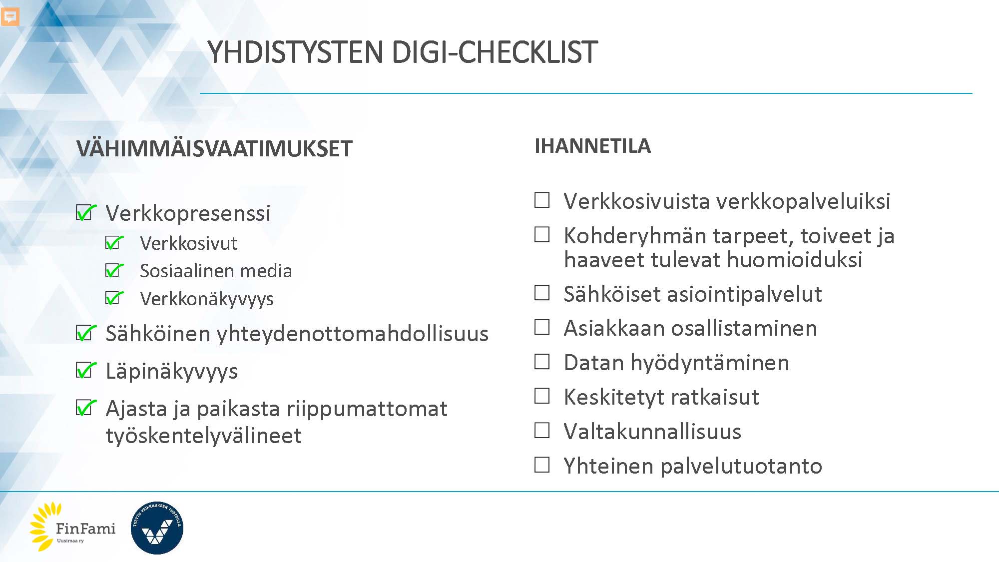 Arto Bäckström avasi taannoin hyvin omassa blogissaan tasoja, joilla digitaalisia palveluita voidaan kehittää. Arto kirjoitti myös siitä, kuinka paljon työtä ja johdon tukea vastaava muutosprosessi vaatii. Lyhyesti VETO-projekti on tarjonnut juuri tätä monitasoista kehittämistä FinFami yhdistysperheen tueksi. Nyt tuki on muuttamassa muotoaan projektin päättymisen kynnyksellä. Tärkeäksi loppuvaiheen tavoitteeksi on noussut luotujen ratkaisuiden ja toimintatapojen jalkauttaminen ja integrointi osaksi kaikkien alueyhdistysten toimintoja. Tällä hetkellä projektissa on mukana Keskusliiton lisäksi seitsemän alueyhdistystä.