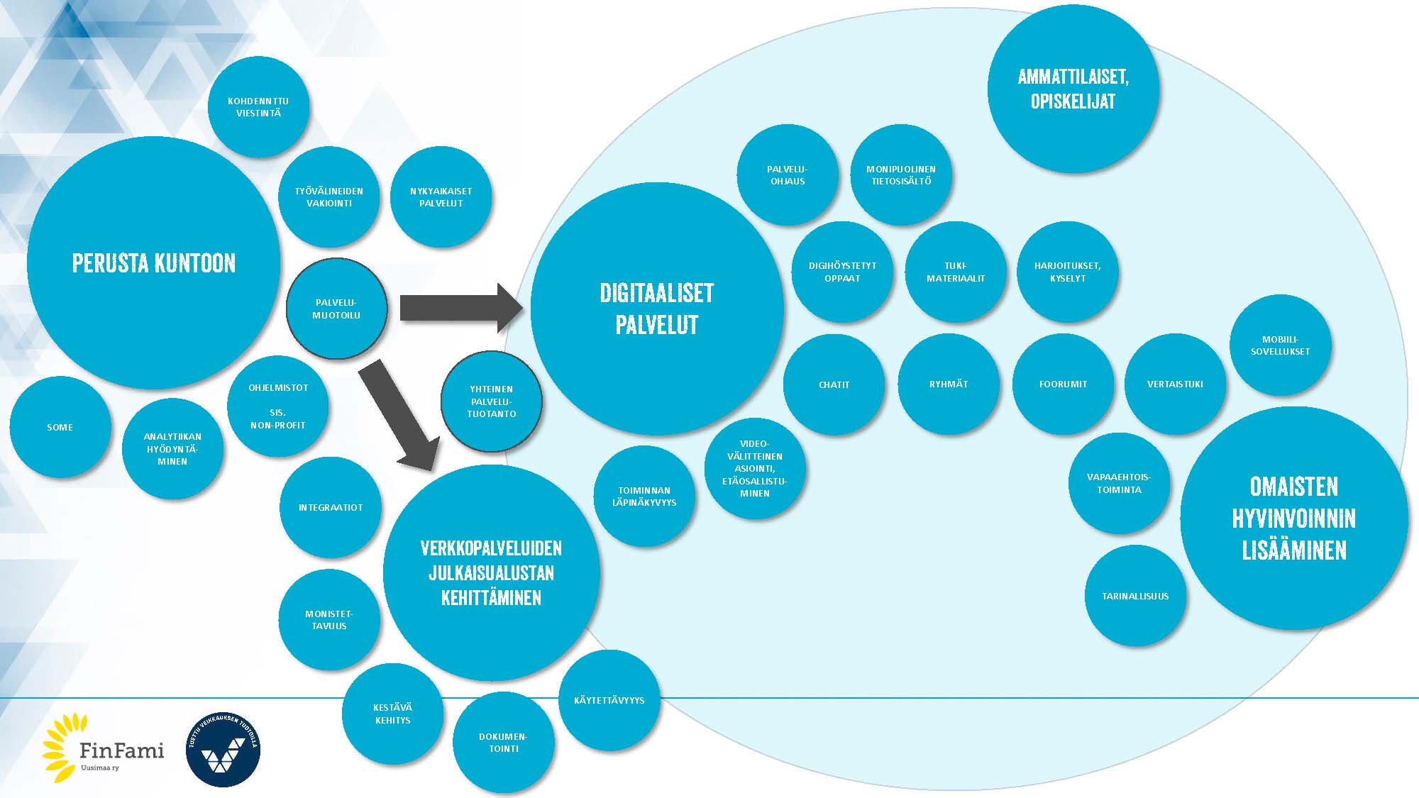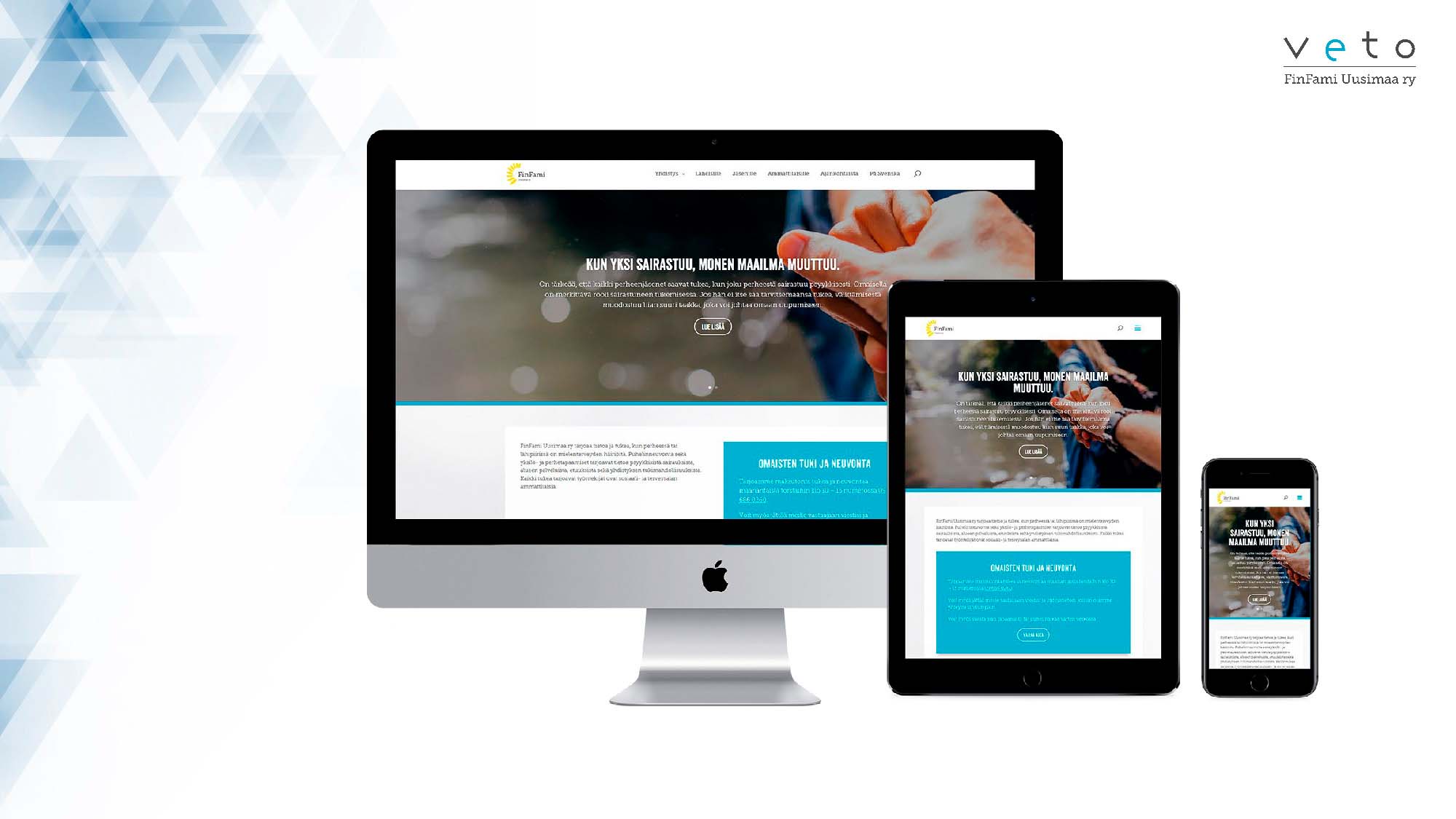 Verkkopalvelupaketin muotoilussa haluttiin korostaa, niin toiminnan läpinäkyvyyttä kuin myös kaikkien toimintojen helppoa tavoitettavuutta. Tärkeää on, että omainen ja läheinen kokee olevansa oikeassa paikassa. Tämä toteutuu, kun hänelle selkeästi kerrotaan mitä, missä ja milloin tapahtuu. Tästä esimerkkinä voidaan pitää FinFami Uudenmaan sivuilla olevien toimintojen ja tapahtumien kuvausten uudelleen muotoilu ja esille nostot luokitellen ja selkeästi. Iso kiitos kokonaisuuden jumppaamisesta menee Uudenmaan tuen ja neuvonnan tiimille. Sivustoille liitettyjen palveluiden helppokäyttöisyydestä haluttiin varmistua niin kohderyhmän kuin myös työntekijöiden näkökulmasta. Siksi VETO-projekti käytti paljon aikaa jatkuvan ja ketterän kehittämisen prosessien omaksumiseksi ja työtavan juurruttamiseksi alueyhdistyksiin. Uudistuksen yhteydessä päivitettiin myös  verkkopalveluita pyörittävä tekniikka, helpottamaan mm. päivittämistä ja ylläpitoa.